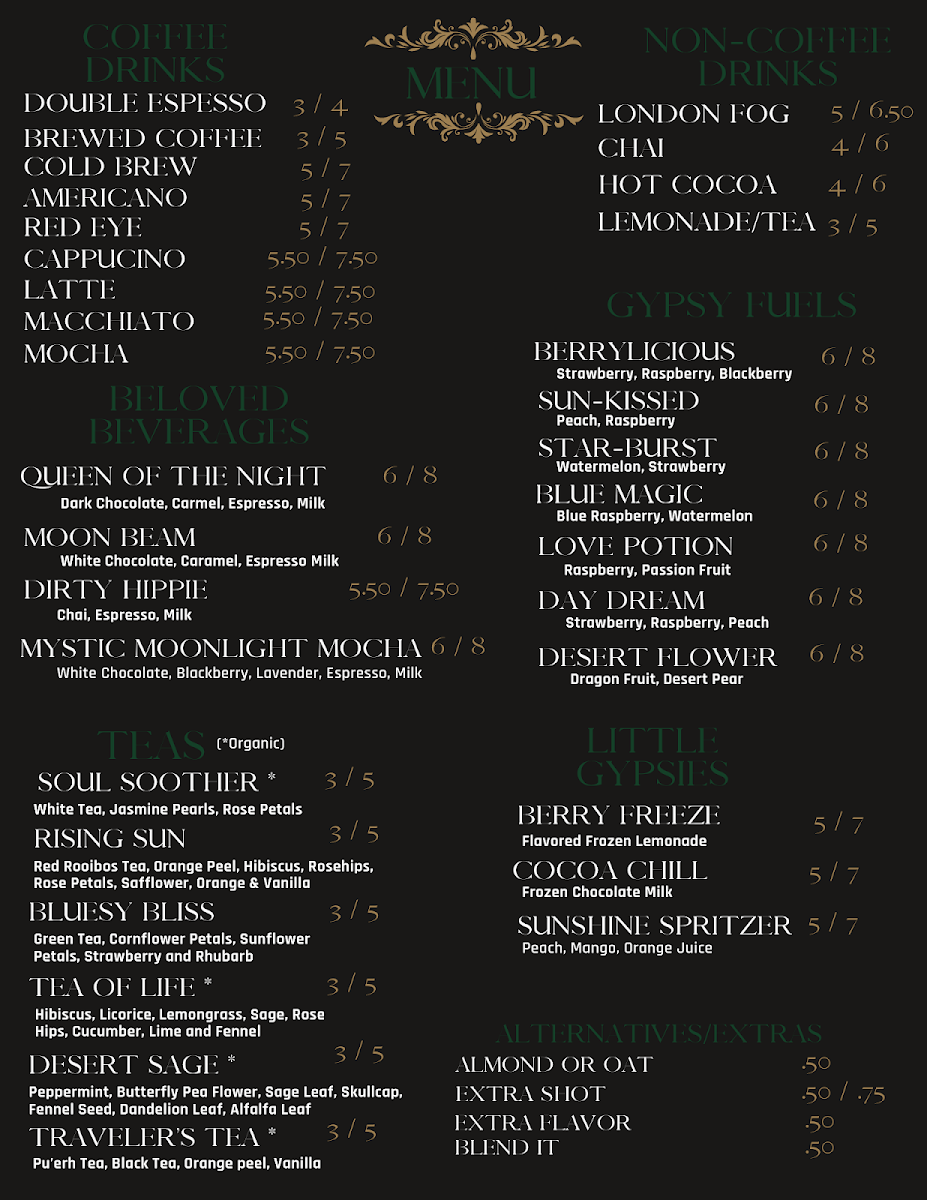 Gypsy Joe's Food Mart & Coffee Shop offers a diverse and eclectic selection of beverages that cater to a variety of tastes. For those seeking something soothing and warm, their London Fog, Chai, and Hot Cocoa Lemonade provide cozy options, perfect for a relaxing moment. For a burst of energy or flavor, try one of the Gypsy Fuels like the fruity Berrylicious, tropical Sun-Kissed, or tangy Star-Burst. There’s also the enchanting Blue Magic and romantic Love Potion, each offering a unique twist on classic favorites. If you're in the mood for something with a bit more character, the Beloved Beverages like the deep and flavorful Queen Of The Night or the smooth Moon Beam are sure to impress. For an edgy, caffeinated pick, you might enjoy the bold Dirty Hippie or the rich Mystic Moonlight Mocha. Tea enthusiasts will find solace in calming selections like Soul Soother or Rising Sun, while the Bluesy Bliss Tea Of Life and earthy Desert Sage add variety to the mix. The Little Gypsies menu features refreshing and light drinks, such as the cool Berry Freeze and tangy Cocoa Chill, as well as the vibrant Sunshine Spritzer. For those craving something more traditional, the Double Espresso, Brewed Coffee, or chilled Cold Brew are available, along with the robust Red Eye and velvety Cappuccino. Whether you're in the mood for a sweet, fruity refreshment or a strong coffee kick, Gypsy Joe's has a delightful array of drinks to satisfy any palate.